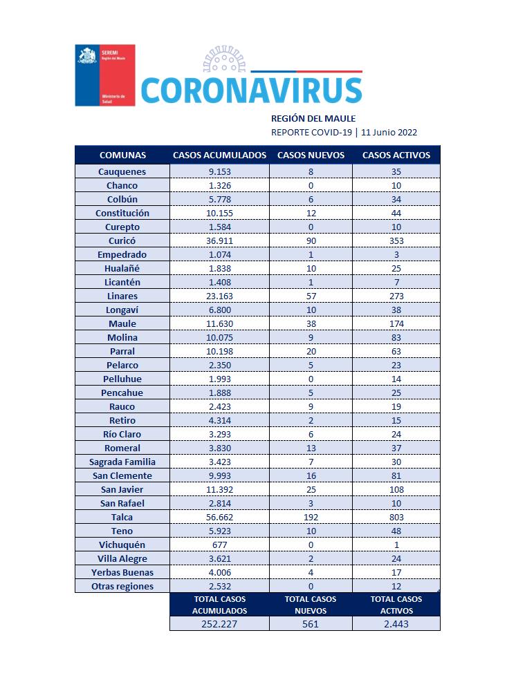 En la Región del Maule este sábado 11 de junio se registraron 561 nuevos casos, con 2.443 casos activos y 252 mil 227 casos acumulados desde el principio de la pandemia.