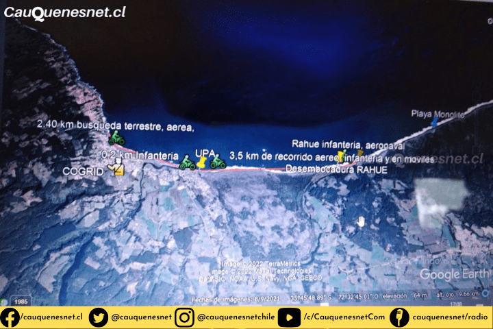 El viernes el monitoreo de la zona se realizó por aire y tierra, participando equipos de la Armada, Carabineros, Bomberos, la Delegación Presidencial Provincial y los municipios de Pelluhue y Cauquenes, pese al despliegue, no hubo resultados positivos. Los trabajos se reanudan a partir de las 9:00 horas de hoy.