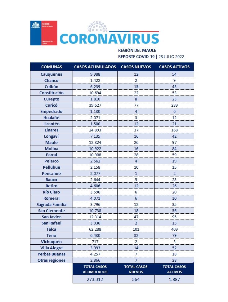 En la Región del Maule este jueves 28 de julio se registraron 564 nuevos casos, con 1.887 casos activos y 273 mil 312 casos acumulados desde el principio de la pandemia.