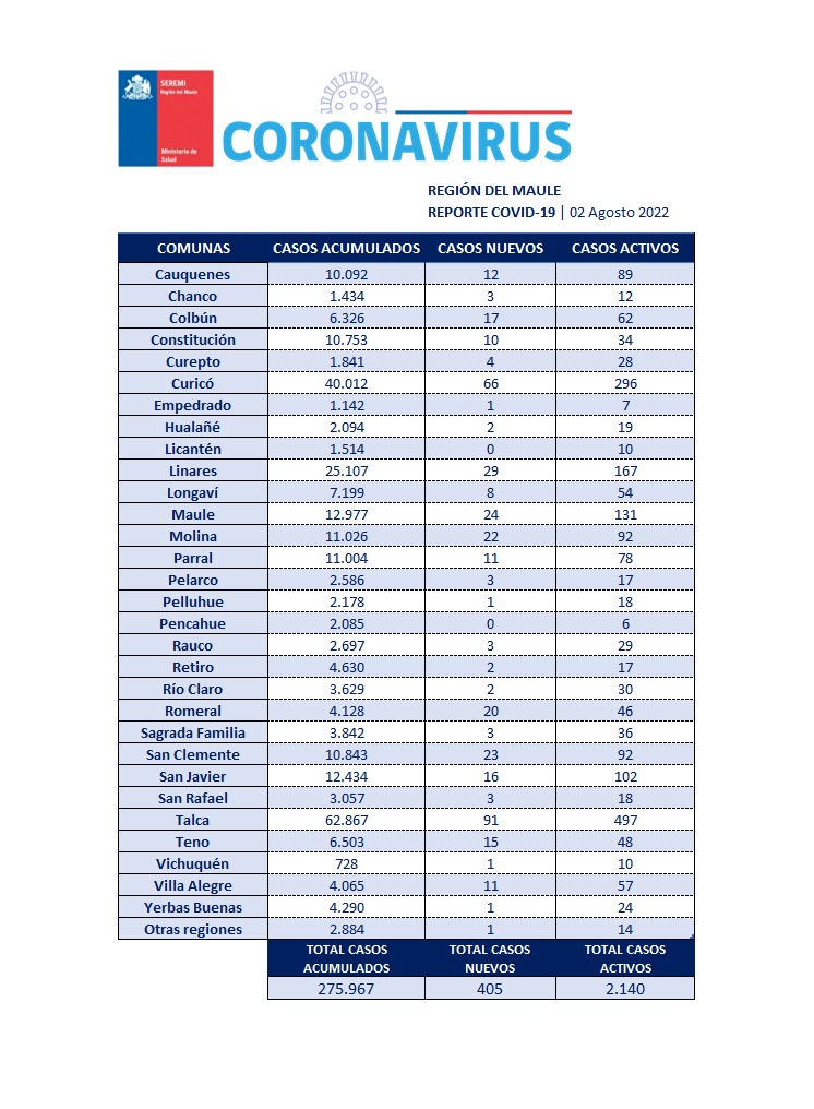 En la Región del Maule este martes 02 de agosto se registraron 405 nuevos casos, con 2.140 casos activos y 275 mil 967 casos acumulados desde el principio de la pandemia.