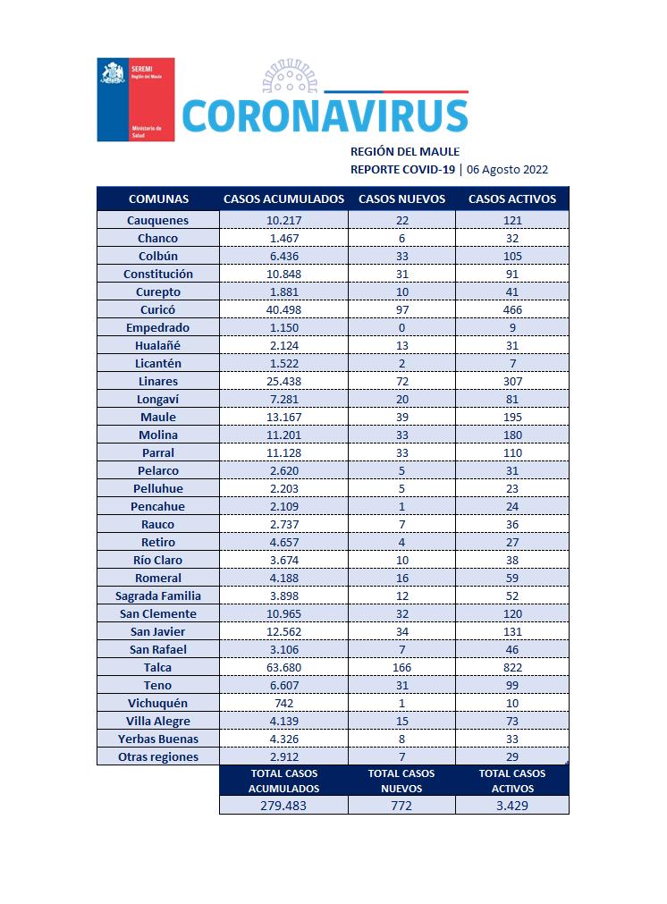 En la Región del Maule este sábado 06 de agosto se registraron 772 nuevos casos, con 3.429 casos activos y 279 mil 483 casos acumulados desde el principio de la pandemia.