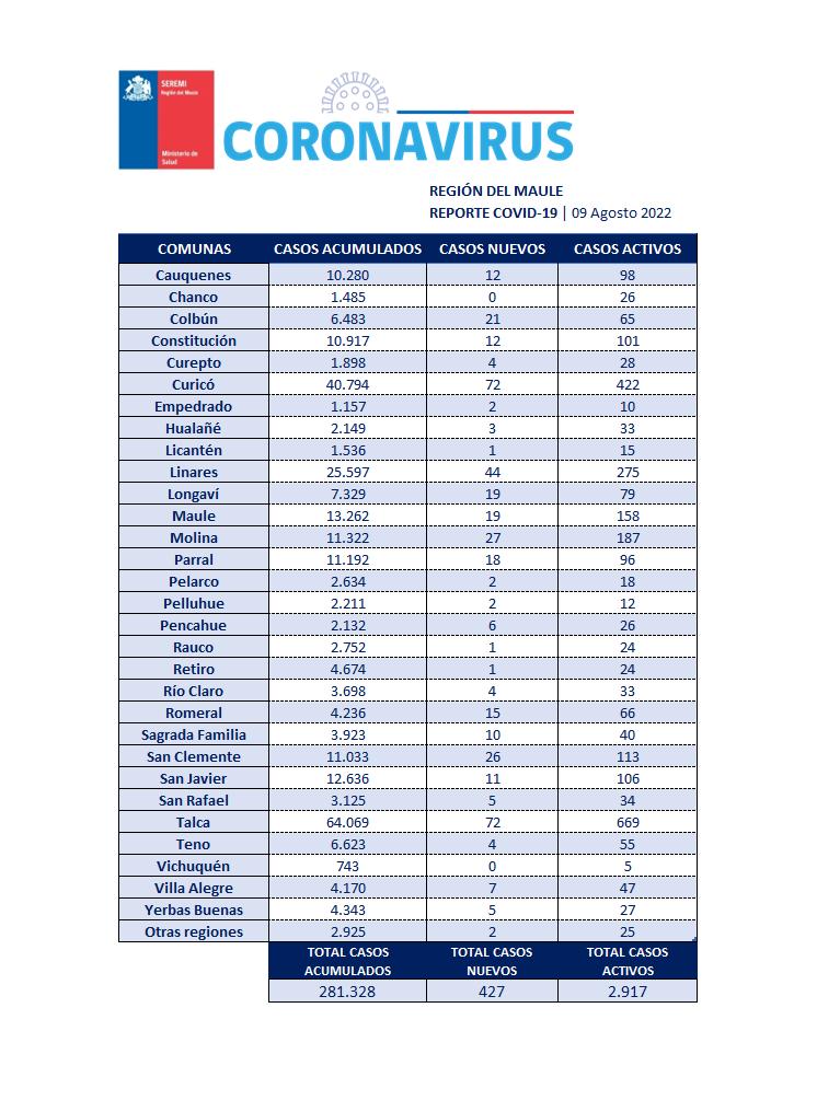 En la Región del Maule este martes 09 de agosto se registraron 427 nuevos casos, con 2.917 casos activos y 281 mil 328 casos acumulados desde el principio de la pandemia.