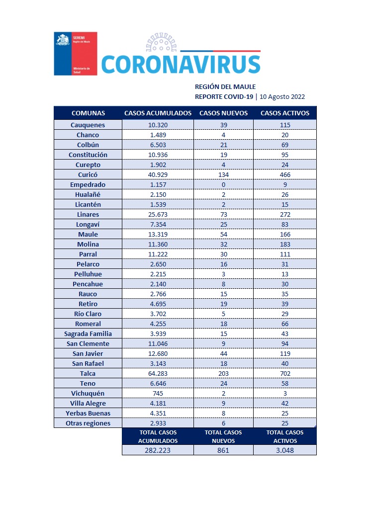 En la Región del Maule este miércoles 10 de agosto se registraron 861 nuevos casos, con 3.048 casos activos y 282 mil 223 casos acumulados desde el principio de la pandemia.