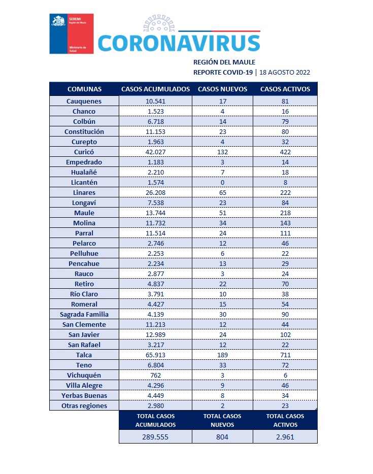 En la Región del Maule este jueves 18 de agosto se registraron 804 nuevos casos, con 2.061 casos activos y 289 mil 555 casos acumulados desde el principio de la pandemia.