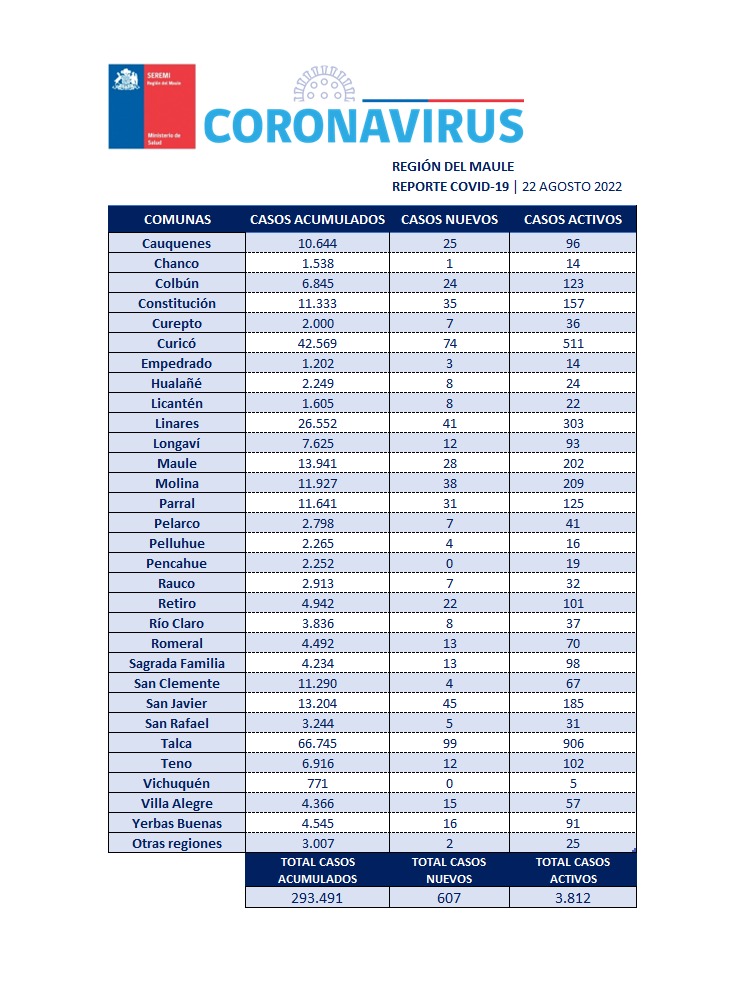 En la Región del Maule este lunes 22 de agosto se registraron 607 nuevos casos, con 3.812 casos activos y 293 mil 491 casos acumulados desde el principio de la pandemia.