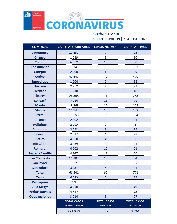 En la Región del Maule este martes 23 de agosto se registraron 359 nuevos casos, con 3.261 casos activos y 293 mil 873 casos acumulados desde el principio de la pandemia.