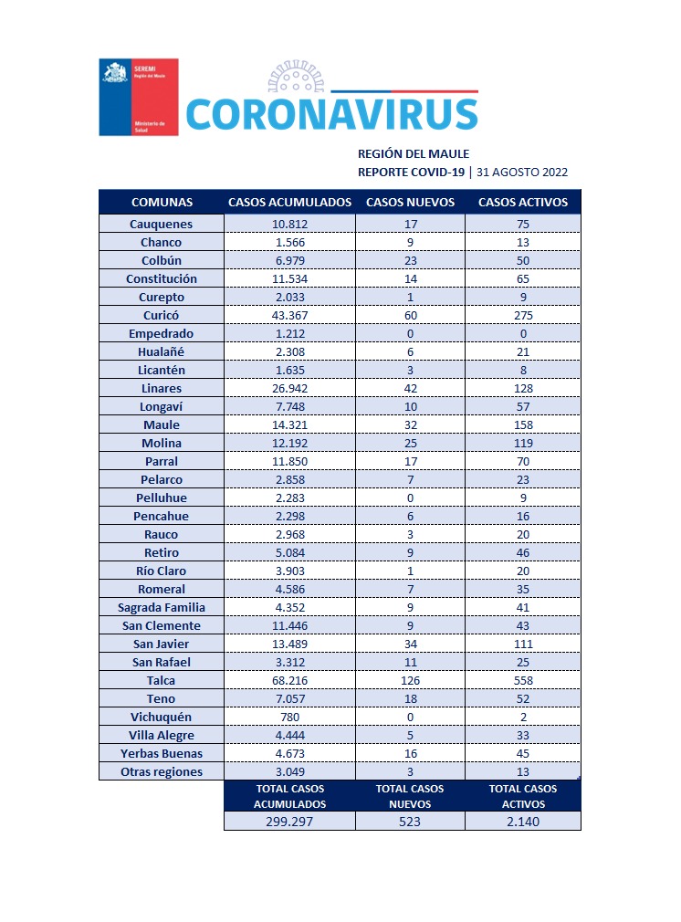 En la Región del Maule este miércoles 31 de agosto se registraron 523 nuevos casos, con 2.140 casos activos y 299 mil 297 casos acumulados desde el principio de la pandemia.