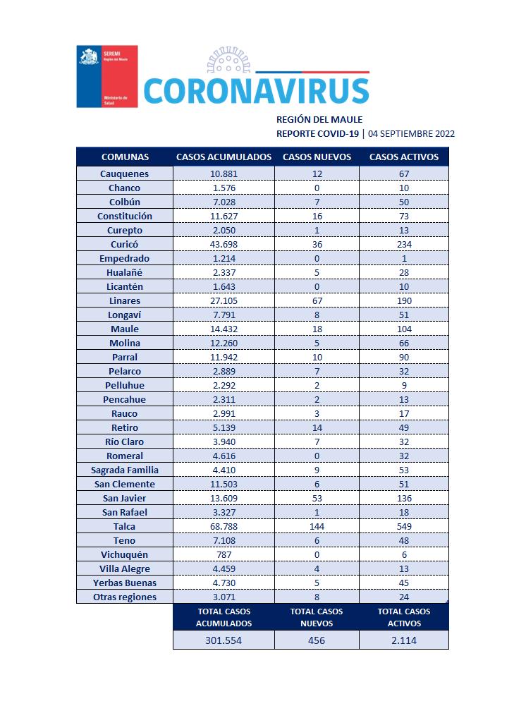 En la Región del Maule este domingo 04 de septiembre se registraron 456 nuevos casos, con 2.114 casos activos y 301 mil 554 casos acumulados desde el principio de la pandemia.