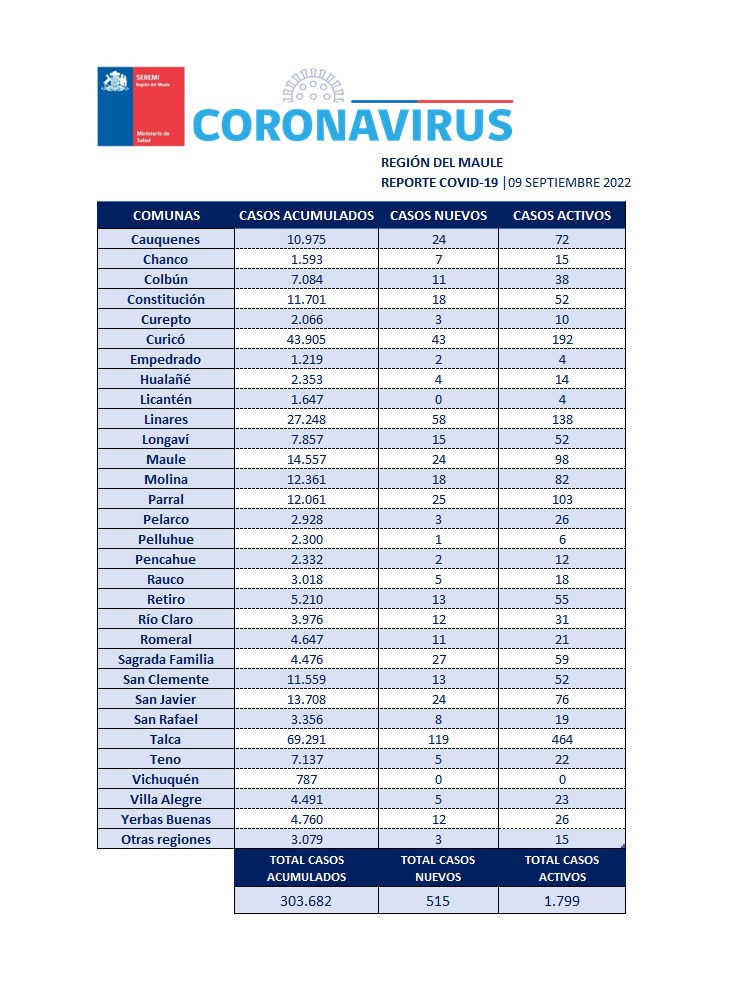 En la Región del Maule este viernes 09 de septiembre se registraron 515 nuevos casos, con 1.799 casos activos y 303 mil 682 casos acumulados desde el principio de la pandemia.