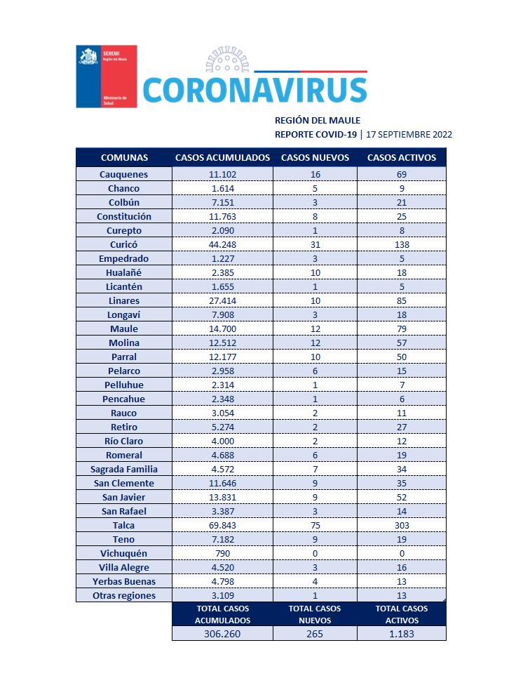 En la Región del Maule este sábado 17 de septiembre se registraron 265 nuevos casos, con 1.183 casos activos y 306 mil 260 casos acumulados desde el principio de la pandemia.