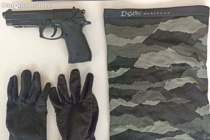 Es así como los oficiales investigadores, al revisar las pertenencias del sujeto que venía de copiloto en el vehículo, se percatan que llevaba consigo un bolso, en cuyo interior se encontró un pasamontaña, un par de guantes y una pistola de aire comprimido, a la que se le están realizando peritajes para comprobar si está apta para disparo.