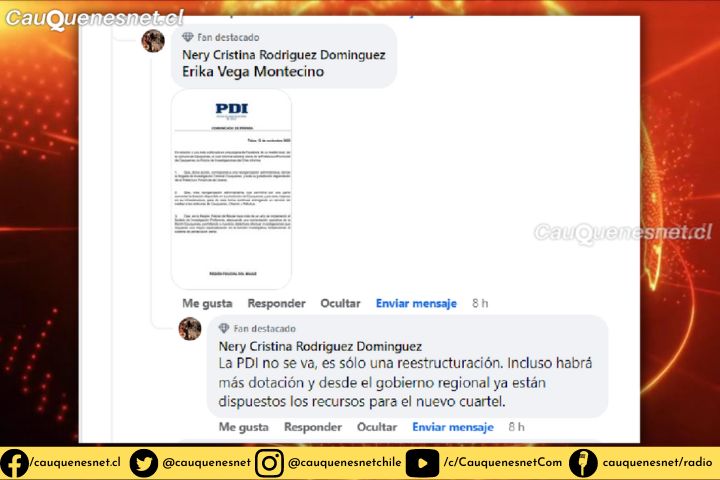 La primera autoridad comunal de Cauquenes, Nery Rodríguez, también se refirió levemente al tema y lo hizo a través de nuestra fanpage, respondiendo a una persona que la interpeló en un comentario y publicando el comunicado que la institución hizo público el pasado sábado. «La PDI no se va, es sólo una reestructuración. Incluso habrá más dotación y desde el Gobierno Regional ya están dispuestos los recursos para el nuevo cuartel», respondió la edil a una usuaria que la instaba a luchar para evitar la partida de la policía civil.