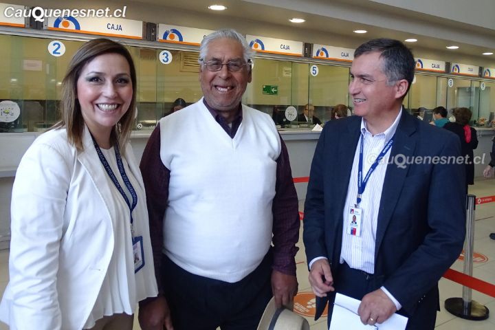 Rostros sonrientes, como el de Manuel Gómez, pensionado de Talca, son los que encontraron en el Centro de Pago, la Seremi del Trabajo y Previsión Social, Maribel Torrealba Retamal y Eugenio Cáceres Castillo, Jefe del Centro de Atención Talca del IPS, quienes llegaron al recinto para dialogar con las personas pensionadas que están recibiendo el beneficio.