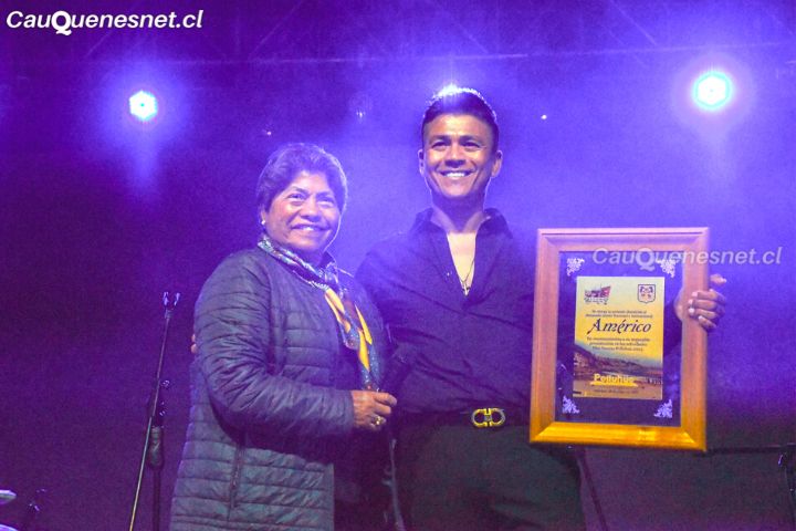 Al finalizar su espectáculo, la alcaldesa María Luz Reyes, entregó un galvano en reconocimiento a la exitosa carrera artística del “Rey de la Cumbia”, quien con más de 30 años en el mundo de la música, visitó por primera vez la comuna de Pelluhue.