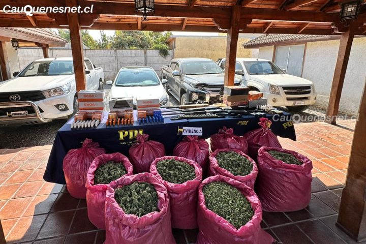 Seguidamente, se ejecutaron siete órdenes judiciales de entrada y registro para los domicilios de los investigados y lugares de acopio en las comunas de Molina y Teno, incautando 83 kilos 960 gramos de cannabis procesada, 11 plantas de la droga en proceso de crecimiento, 1 millón 555 mil pesos en efectivo, 2 escopetas de repetición, 1 pistola 9mm con 03 cargadores, 1 pistola 9mm a fogueo, 1 rifle de aire comprimido, 4 vehículos, 3.231 cartuchos de escopeta calibre 12, 117 cartuchos calibre 9mm y 100 cartuchos calibre 9mm de fogueo, entre otros elementos.