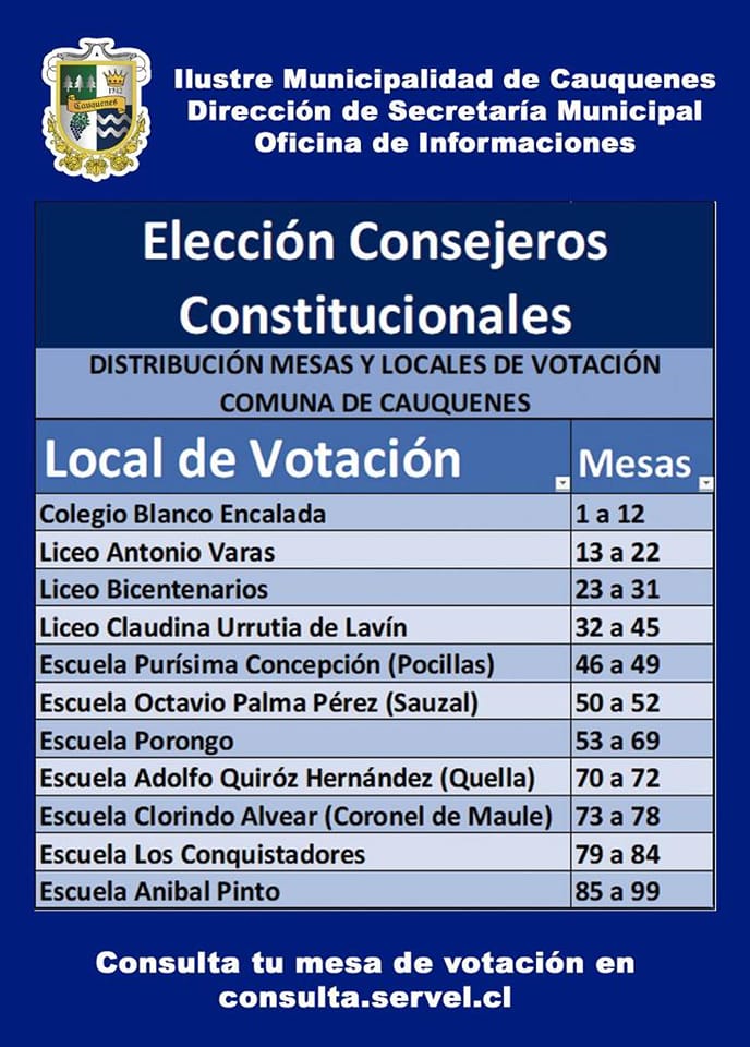 En Cauquenes, en estas elecciones hay 11 locales de votación dispuestos en toda la comuna y el municipio local publicó qué mesas están en cada local de votación.