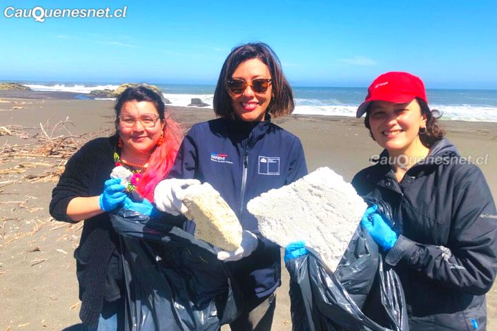 Pedazos de residuos, vasos de plástico, botellas PET, vidrios, bombillas, bolsas, envoltorios de comida, colillas de cigarro, redes y equipos de pesca desechados y numerosos trozos de plumavit dispersos por la arena, fueron retirados por las y los voluntarios que participaron en la jornada de limpieza de playas realizada en la Caleta Loanco, en la comuna de Chanco.