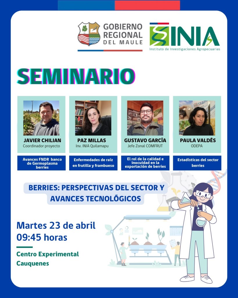 #CAUQUENES: Con expositores de INIA, ODEPA y COMFRUT se realizará seminario que pondrá énfasis en el rubro de los berries y la importancia de la calidad fitosanitaria para su manejo, producción y comercialización. Esta actividad se enmarca en el programa FNDR Transferencia Generación de banco de Germoplasma para la obtención de plantas de calidad, ejecutado por INIA y financiado por el Gobierno Regional del Maule.