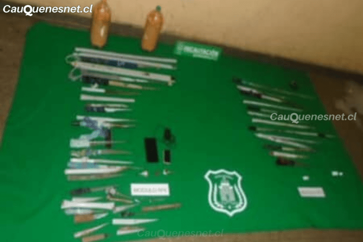 #CAUQUENES: En el penal cauquenino se incautó un número importante de armas cortopunzantes elaboradas por los mismos internos, seis litros de chicha, teléfonos celulares y una sierra metálica, entre otros elementos. Esta acción se enmarca en el Plan de Seguridad Penitenciaria Contra el Crimen Organizado y es el décimo cuarto procedimiento realizado este 2024 a nivel nacional.