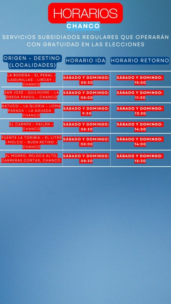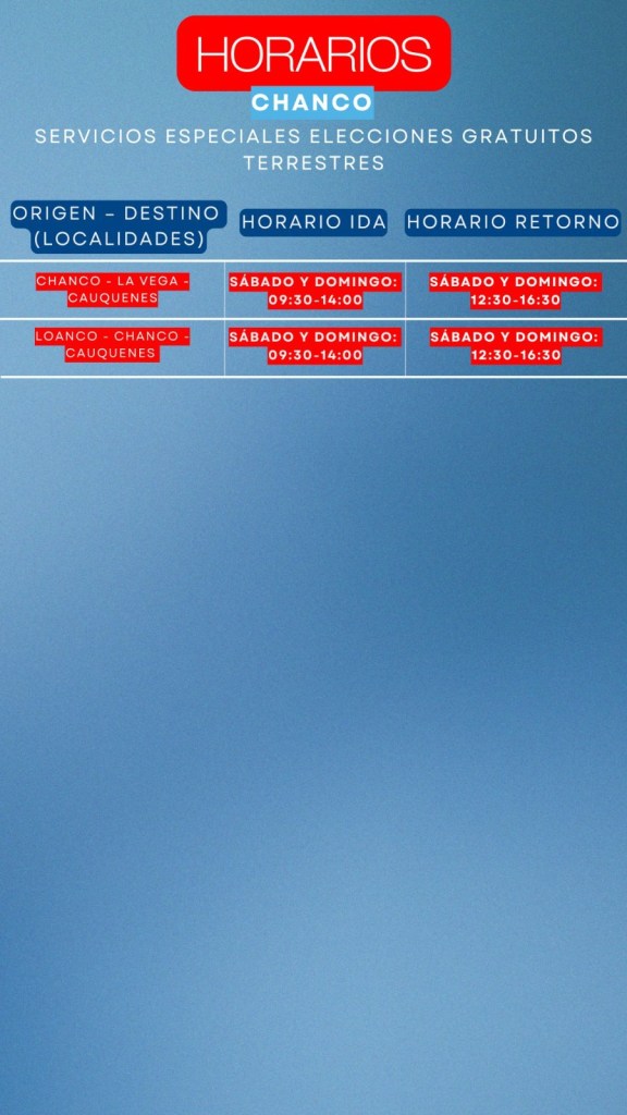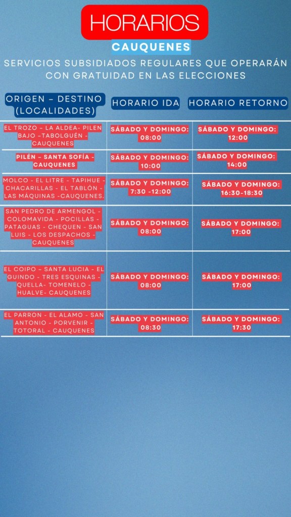 Son los servicios subsidiados que operan con regularidad, pero que para estas elecciones regionales y comunales operarán de manera gratuita en Cauquenes, Chanco y Pelluhue.