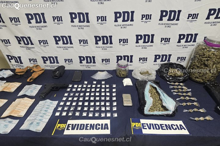 En el lugar, se logró incautar 121,7 gramos de clorhidrato de cocaína a granel y dosificada, 3.440,81 gramos de cannabis a granel y dosificada, además de dinero en efectivo por un monto de 1 millón 310 mil pesos, a lo que se suma una pistola de aire comprimido con dos fundas (una tipo sobaquera y funda al cinto), un cartucho calibre 9 mm y elementos asociados al pesaje y dosificación de drogas.