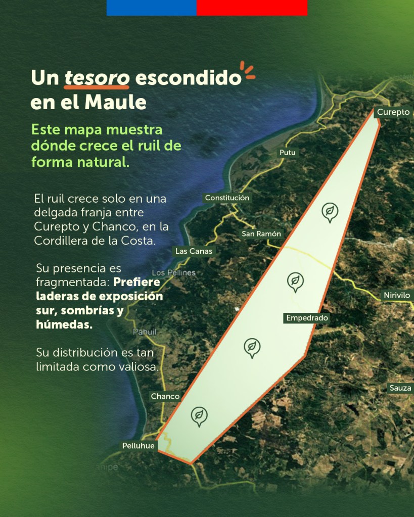 El escenario es complejo. La crisis climática, el estrés hídrico y los incendios forestales mantienen amenazada de desaparecer a la especie arbórea ruil, endémica del Maule, reduciendo su población en las últimas décadas. De hecho, entre 1981 y 2003 registró una disminución del orden de un 60%. Actualmente, según datos de la CONAF, se estima una superficie aproximada de 300 hectáreas de esta especie, de las cuales 89 están en la Reserva Nacional Los Ruiles, en la comuna de Chanco, provincia de Cauquenes.