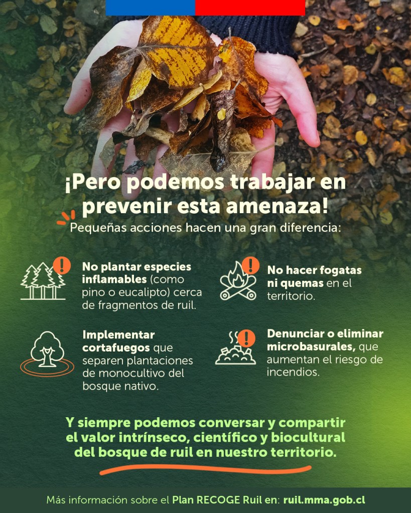 ha ocurrido una veintena de mega incendios forestales, coincidiendo con la mega sequía y con las temperaturas más altas en registros para la zona central del país. Las poblaciones de ruil se encuentran rodeadas de una matriz forestal, cuya densidad y cobertura son material de combustión con rápida propagación del fuego tanto a nivel de copa como bajo el dosel.