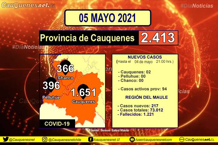 Sigue leyendo "05 de mayo 2021: #Cauquenes presenta 2 nuevos casos de Covid-19 y mantiene 82 casos activos"